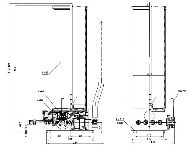| 四、安裝及調試 安裝: 1、SRB-J7-4/4型手動潤滑泵應安裝在以通風、透光的室內,露天安裝使用必須加設防護罩,同時必須保證手柄能自由擺動。油位指示桿上方應有足夠的空間,以便油位指示桿能伸出,還能方便地向貯油器中加油潤滑脂。 2、SRB-J7-4/4型手動潤滑泵必須直立安裝,并用四只M10×30螺栓緊固。 3、泵與主油管及系統中配管的連接處應緊密,不得有滲漏現象,不允許使用麻絲或鉛油等輔助材料。 調試: 1、加潤滑脂必須從加油過濾器裝置中用專用的加油 泵注入,嚴禁揭蓋加油,防止油中油臟物或空氣混合,致使泵不能正常工作。加入潤滑脂的針入度為不低于265(25℃,150g)1/10mm。 2、起動前,應向壓力表接頭內注50#機械油,以便干油進入壓力表而影響顯示精度。 3、當手柄來回扳動,這時潤滑脂將被入主油管中,系統中的給油器全部工作后壓力上升,應停止供油,同時要及時換向,以便消除管路中油壓力。 五、使用及注意事項 使用: 1 潤滑脂必須從加油口用專用加油泵向貯油器中加入,并觀察油位指示桿上的刻度線,即可知道加滿與否。 2、連接供油管,采用GB9065.3膠管接頭8I與系統中管路連接。 3、應保持潤滑泵的清潔,防止酸、堿等物的腐蝕。 注意事項: 1、加油過濾器的濾芯應定期清洗。 2、柱塞泵的活塞與泵體內孔的配合間隙極小,必須嚴格控制臟物進入,以免影響正常工作。 3、貯油桶內油位下降至下位時應及時加注,不得再扳動手柄以便空氣進入管路影響潤滑效果。 六、故障原因及排除 潤滑泵使用不當時,會出現壓力不上升或壓力急劇上升的現象。 1、壓力不上升,主要是由于泵內含有空氣或泵內單向閥失靈,以及配管連接處有泄漏造成,查明原因后消除,即可恢復正常。 2、壓力急劇上升凡要是由于管道堵塞或分配器動作不良以及換向閥沒有換向造成,查明原因后排除之,即可正常工作。 | |||||||||||||