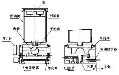 手動(dòng)潤(rùn)滑泵是借人工擺動(dòng)手把,通過(guò)齒輪帶動(dòng)齒條活塞往復(fù)運(yùn)動(dòng)實(shí)現(xiàn)向外供油的,當(dāng)活塞處于圖示極限位置時(shí),潤(rùn)滑脂通過(guò)吸入口吸入并充滿(mǎn)活塞的右腔,當(dāng)活塞向右移動(dòng)時(shí),被吸入的潤(rùn)滑脂在油壓的作用下頂開(kāi)單向閥壓送至出口向外排出,當(dāng)系統(tǒng)中主分配器的一計(jì)量油口返回至回油指示器的油量達(dá)到3.2mL時(shí),指示桿全部伸出,證明系統(tǒng)所有潤(rùn)滑點(diǎn)已得到所需的潤(rùn)滑油量,此時(shí)停止操作手把并把指示桿向內(nèi)壓進(jìn),為下循環(huán)準(zhǔn)備,指示器內(nèi)的潤(rùn)滑脂經(jīng)單向閥返回貯油桶內(nèi)。