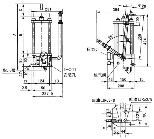 | 六、使用說(shuō)明 1、手動(dòng)潤(rùn)滑泵應(yīng)垂直安裝,泵的上方及周?chē)粲兄甘緱U上升及補(bǔ)脂操作的空間。需在室外或環(huán)境惡劣的場(chǎng)合安裝時(shí),應(yīng)將泵置于防護(hù)罩內(nèi)。 2、貯油器內(nèi)無(wú)潤(rùn)滑脂時(shí),不許操縱手柄,至下油位應(yīng)及時(shí)補(bǔ)脂。 3、向貯油器內(nèi)補(bǔ)脂,必須使用手動(dòng)或電動(dòng)補(bǔ)脂泵從補(bǔ)脂口充填。 4、安全閥出廠已調(diào)至公稱(chēng)壓力,無(wú)故不許隨意調(diào)節(jié)。 5、泵上回油指示器的作用是操作者通過(guò)觀察指示器活塞指示桿的運(yùn)動(dòng)行程,就可知道潤(rùn)滑系統(tǒng)的供油狀況。使用時(shí),先計(jì)算好各潤(rùn)滑部位所需的給油量,配置分配器,并把主分配器上多設(shè)的一個(gè)出油口與手動(dòng)潤(rùn)滑泵的回油口接通,使?jié)櫥祷氐街甘酒髦?,如返回的油量累?jì)達(dá)到3.28mL,則指示器的活塞指示桿全部伸出,表示各潤(rùn)滑點(diǎn)已根據(jù)需要完成一個(gè)周期的給油,應(yīng)停止供油并把回油指示器的指示桿推進(jìn)。 | |||||||||||||||||||||||||