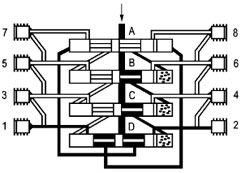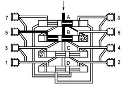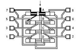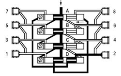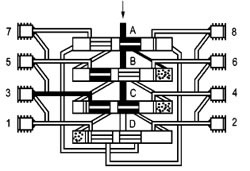 當(dāng)活塞D打通通向活塞A左側(cè)終端的連接通道后,潤(rùn)滑劑流動(dòng)并將活塞A向右推動(dòng)。位于活塞A前右側(cè)的潤(rùn)滑劑輸送到排出口1。 這時(shí)活塞B至D從左側(cè)向右側(cè)運(yùn)動(dòng),按以上相反方向順序動(dòng)作完成一個(gè)周期循環(huán)并可重新開(kāi)始一個(gè)新的循環(huán)。