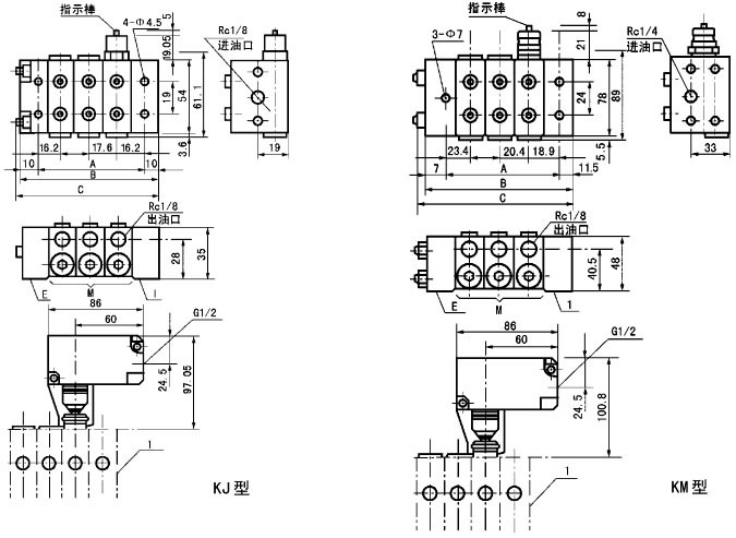 一、概述 KJ、KM、KL系列單線遞進(jìn)式分配器,適用于潤(rùn)滑點(diǎn)密集、耗脂量不同,給油頻繁單線集中潤(rùn)滑系統(tǒng)中,組成子母式分配系統(tǒng)實(shí)現(xiàn)分區(qū)控制進(jìn)行潤(rùn)滑的場(chǎng)合。 KJ、KM、KL系列單線遞進(jìn)式分配器,它由中碳合金結(jié)構(gòu)鋼制造的供給體、端部體和3~8片根據(jù)設(shè)計(jì)需要所確定的給油量和出油口數(shù)的中間體組合而成。分配器的正常出口設(shè)置于分配器的兩側(cè)面,在上面還設(shè)置有預(yù)備出口,各中間體的出油口內(nèi)均裝有止回閥,能徹底防止因潤(rùn)滑點(diǎn)背壓作用而產(chǎn)生潤(rùn)滑脂的逆流,保證了各出油口的給油量定量、準(zhǔn)確。