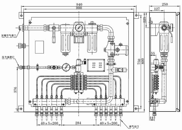 | 油氣衛星站由二位二通電動止回閥、KM型單線油分配器、氣動三聯件、二位二通氣動電磁閥、油氣混合器以及各種連接件等組成。潤滑油供應站供送過來的壓力油,經二位二通電動止回閥、KM型單線油分配器定量分配,分配出的若干份油分別送至各口的油氣混合器進行油氣充分混合,而后分別向后級的油氣分流器進行再分流或直接供向潤滑點。衛星站的工作控制接受油氣潤滑系統的主PLC電氣控制箱控制。 | ||||||||||